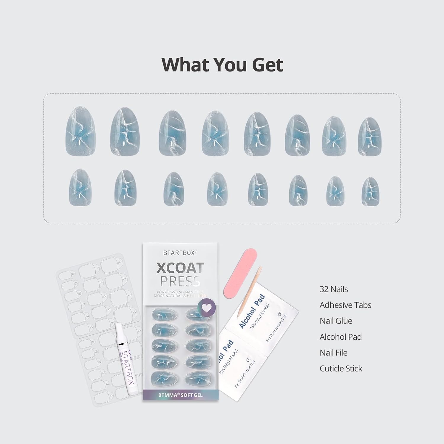 BTArtbox Press On Nails Short - Lamp-Curable Sparkly Blue Almond Press On Nails with Glue for Women, Semi-Transparent Soft Gel Glue On Nails in 16 Sizes - 32 Stick On Nails Kit, Blue Mirage