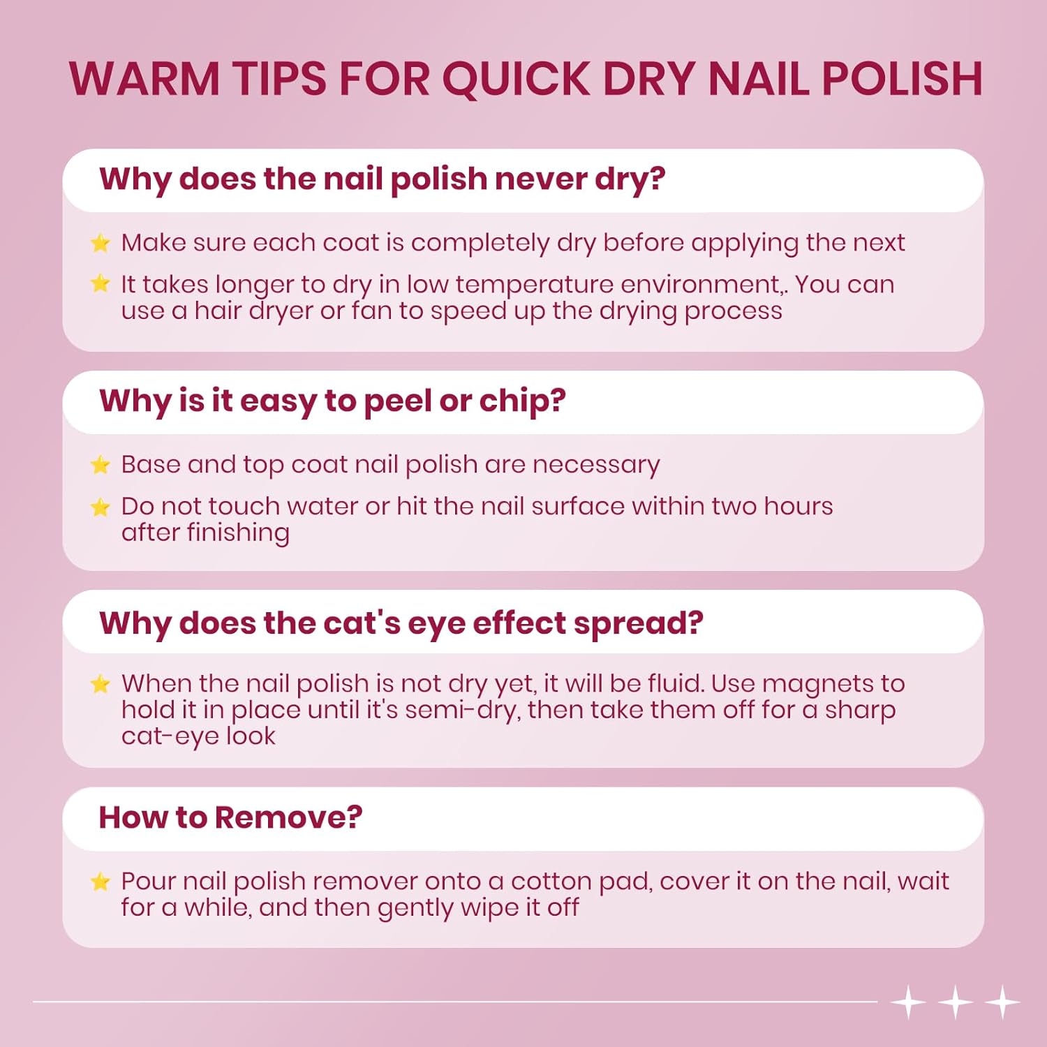 - Important Tips: 1. When the nail polish is not dry yet, it will be fluid. Use magnets to hold it in place until it's semi-dry, then take them off for a sharp cat-eye look 2. Do not touch water or hit the nail surface within two hours after finishing to avoid peeling; 3. Base and top coat nail polish art necessary