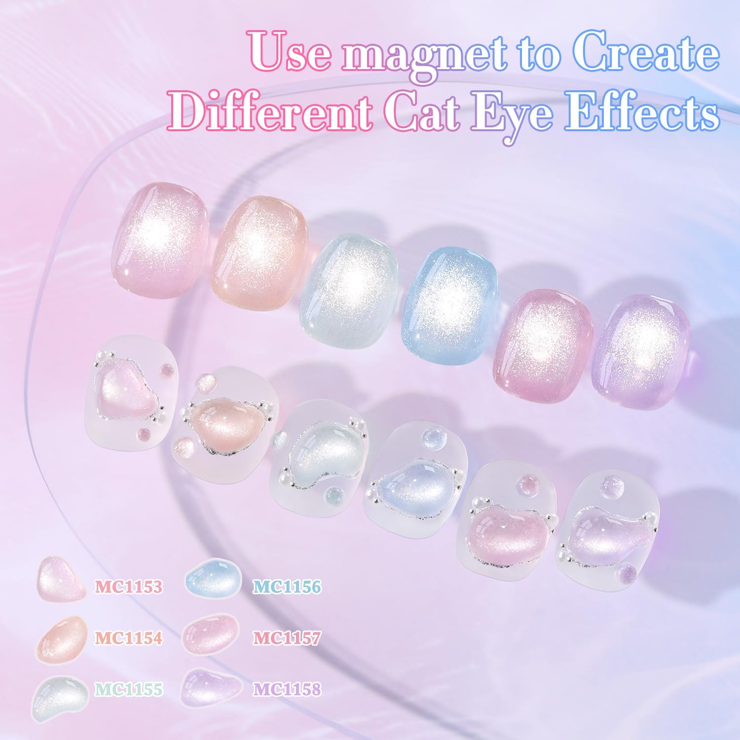 - Cat Eye Gel Nail Polish Set: Double Rhythm cat eye gel nail polish kit includes 6colors 7.5ml / 0.25 fl.oz gel nail polish. This cat eye gel nail polish set includes.Each kit comes with one magnetic tool for you to create a different cat eye style for your nails.