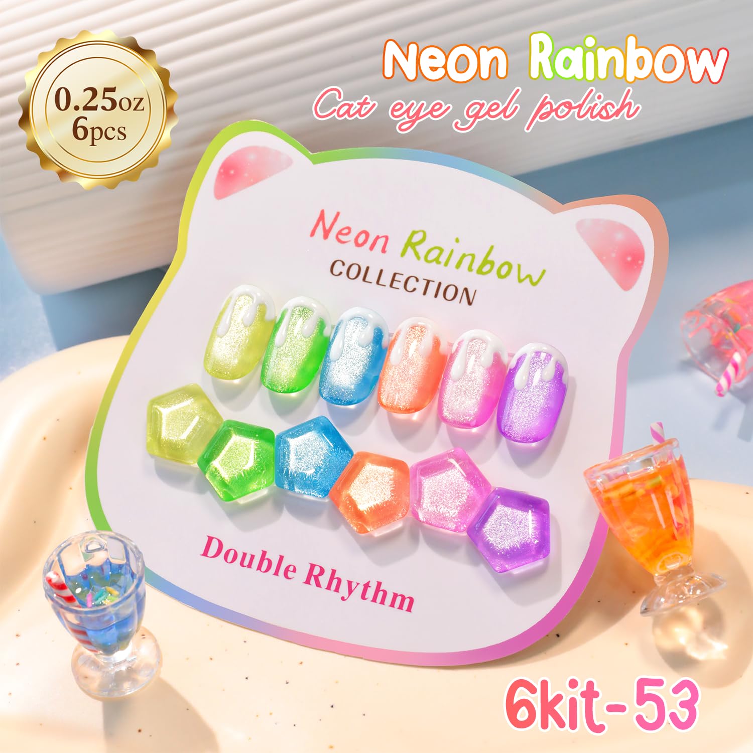 - Cat Eye Gel Nail Polish Set: Double Rhythm cat eye gel nail polish kit includes 6colors 7.5ml / 0.25 fl.oz gel nail polish. This cat eye gel nail polish set includes.Each kit comes with one magnetic tool for you to create a different cat eye style for your nails.