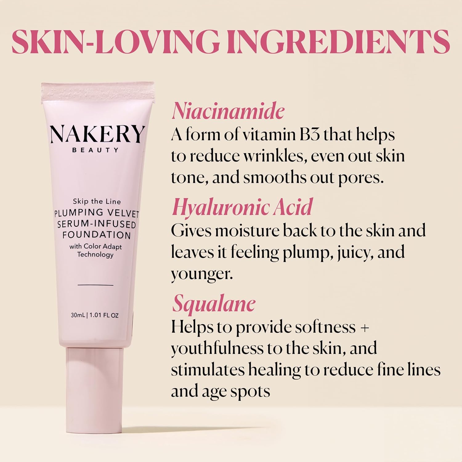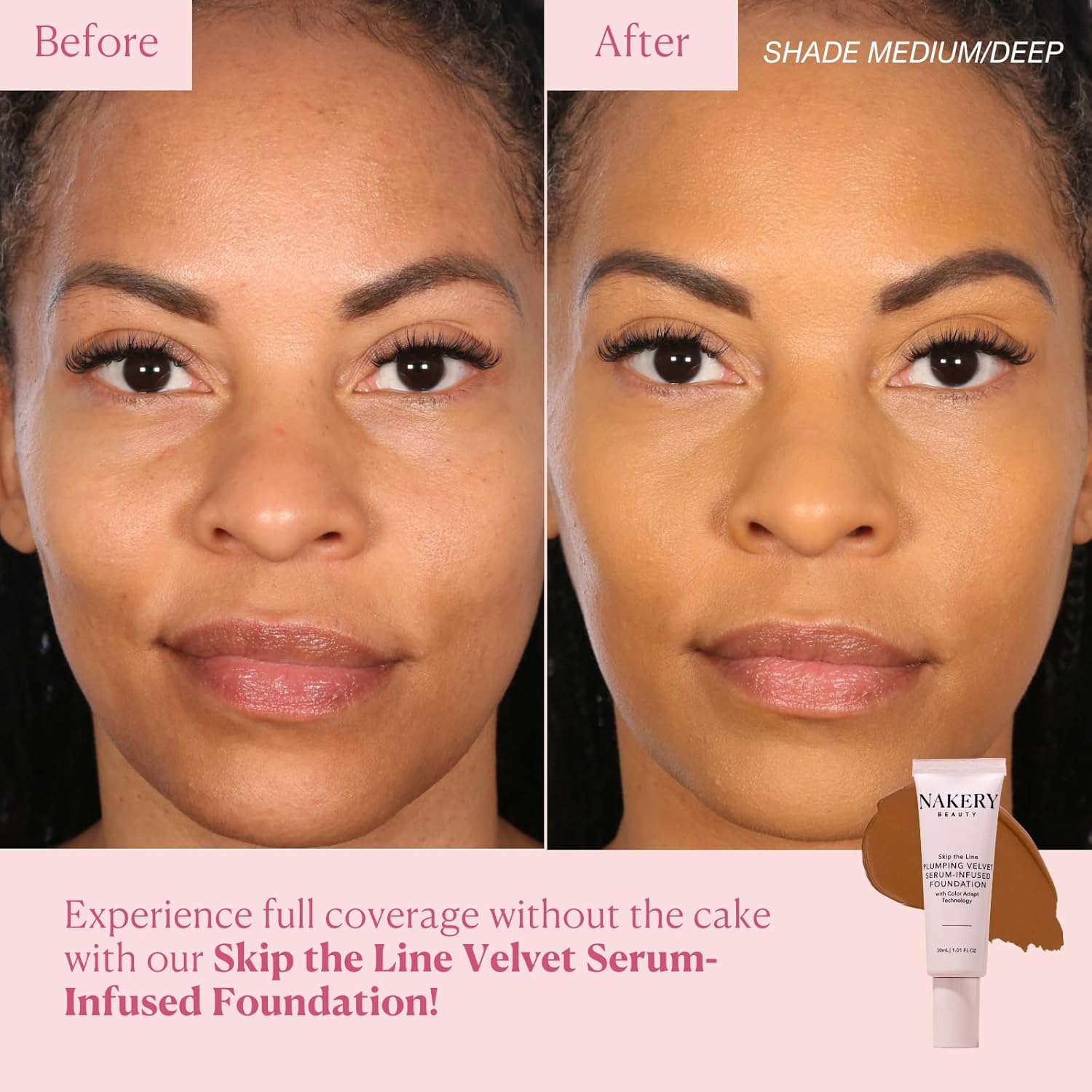 Nakery Skip the Line Full Coverage Foundation for Women - Plumping Velvet Womens Foundation Makeup Matte Finish - Age Defying Foundation - Moisturizing Foundation with Smart Color Adapt - Medium Deep