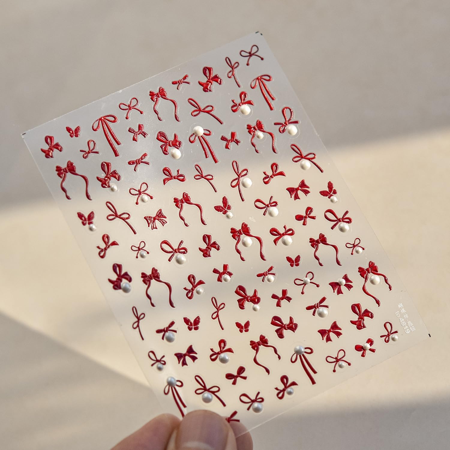 Bow Nail Art Stickers 5D Embossed Nail Decals Self Adhesive Red Nail Sticker for Nail Art Pearl Design for Women Girls Supplies Nail Art Decorations Accessories