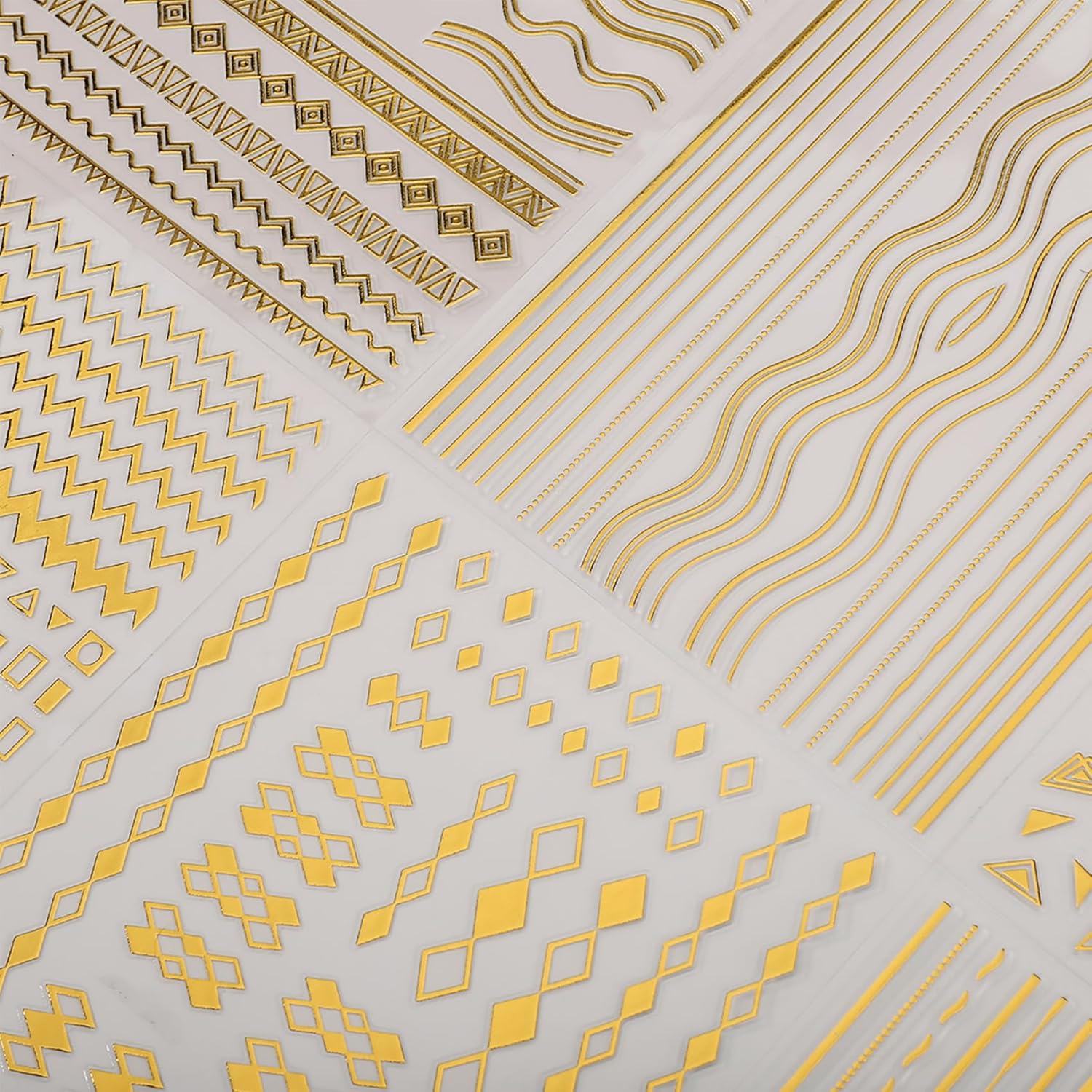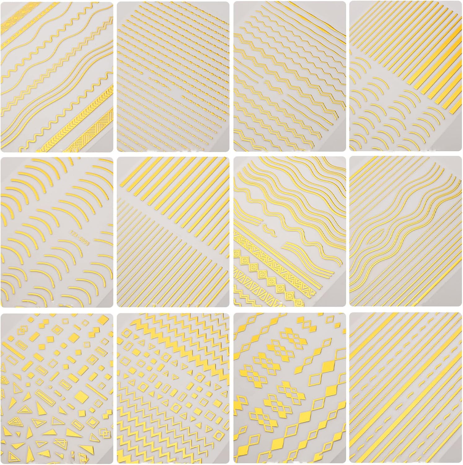 12 Sheets Gold Line Nail Art Stickers - French Smile Waves Strip Self-Adhesive Nail Decals for DIY Geometric Manicure
