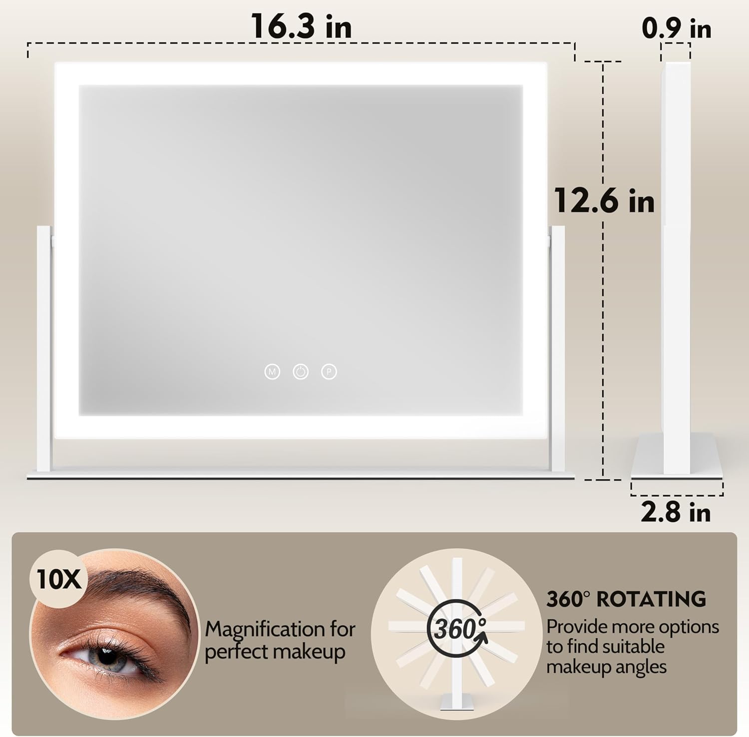 - đăOversized View & 360° Rotationă The large 16'' x 12'' mirror offers a full-face view for effortless makeup, skincare, or hair styling. With 360° swivel and a sturdy aluminum frame, it stays stable while giving you the perfect angle.