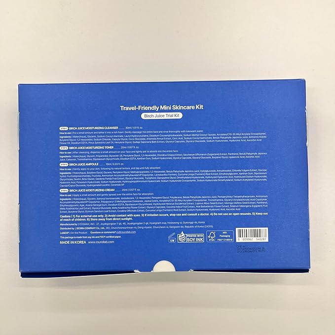- [ALL-IN-ONE BESTSELLER KIT] Experience ROUND LAB’s most loved Birch Juice Moisturizing line in one essential mini Kit. Includes Cleanser 30ml, Toner 20ml, Serum 10ml, Cream 20ml for a hydration 4-step routine