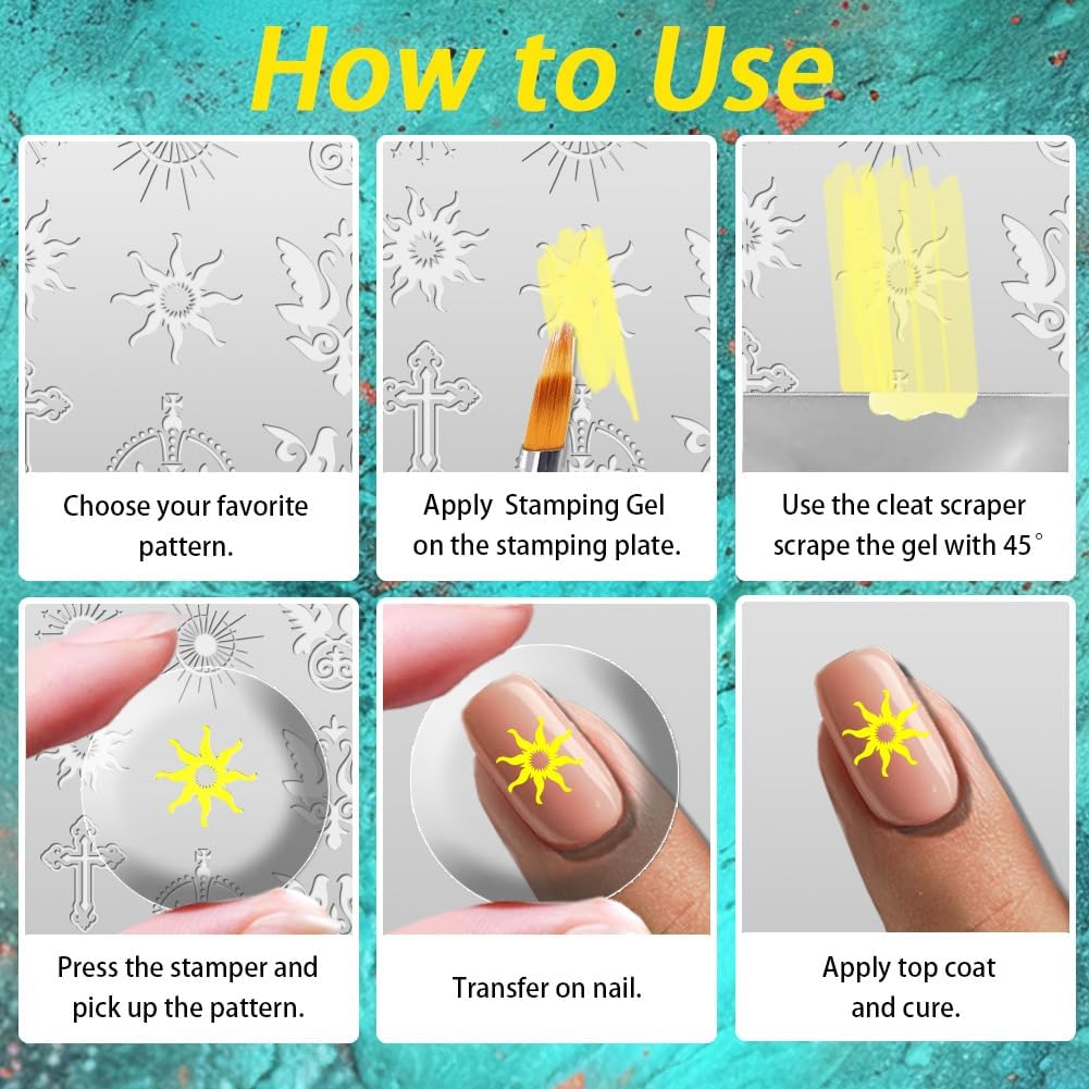 - Easy to Use: 1. Apply paint adhesive to the stencil, then use the scraper to quickly scrape off the excess 2.Use silicone stamper to press down on the transfer pattern 3. Quickly transfer the pattern onto your nails 4.Bake dry to apply sealer then shine the lamp