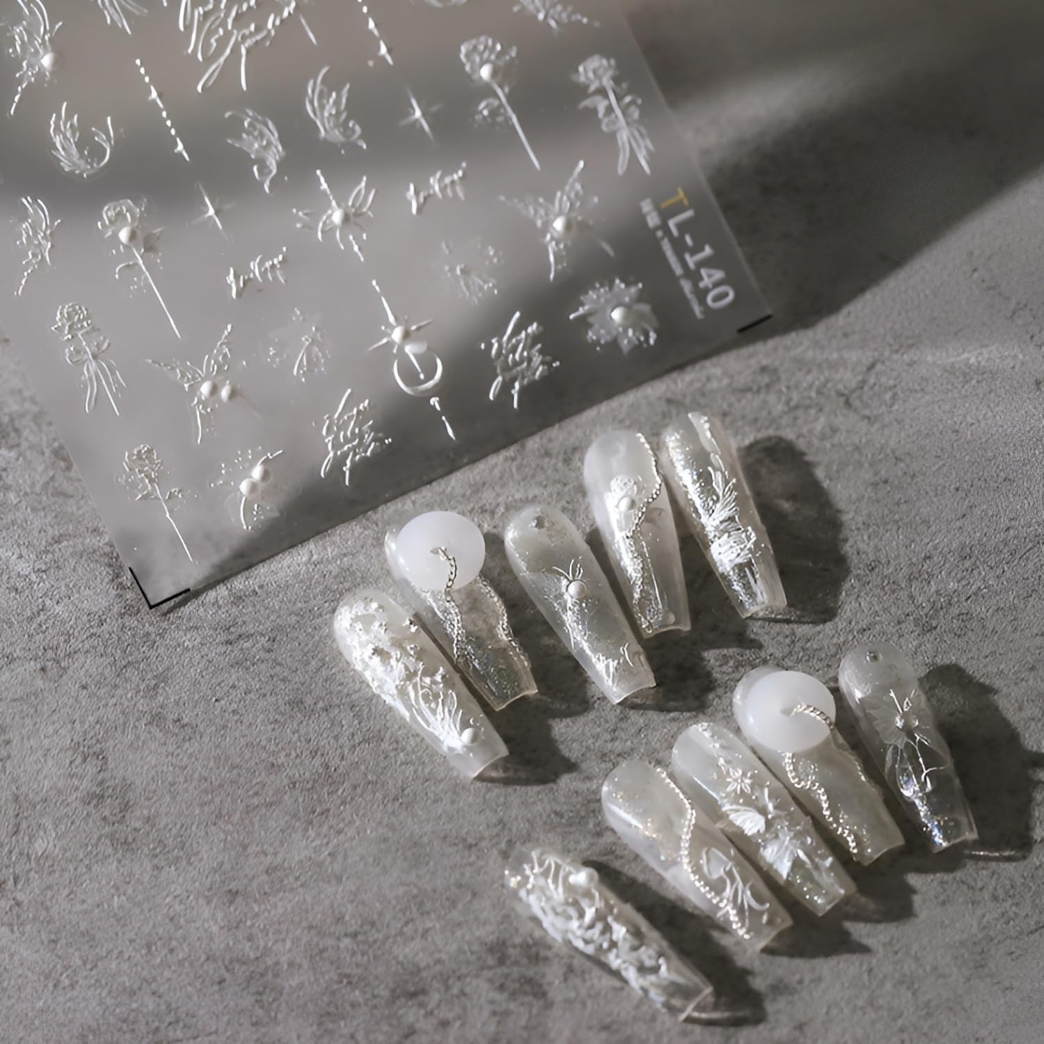 5D Embossed White Butterfly Flower Nail Stickers for Nail Art White Moon Star Nail Art Stickers White Nail Decals with Pearl Design Spring Summer Nail Supplies for Women Girls