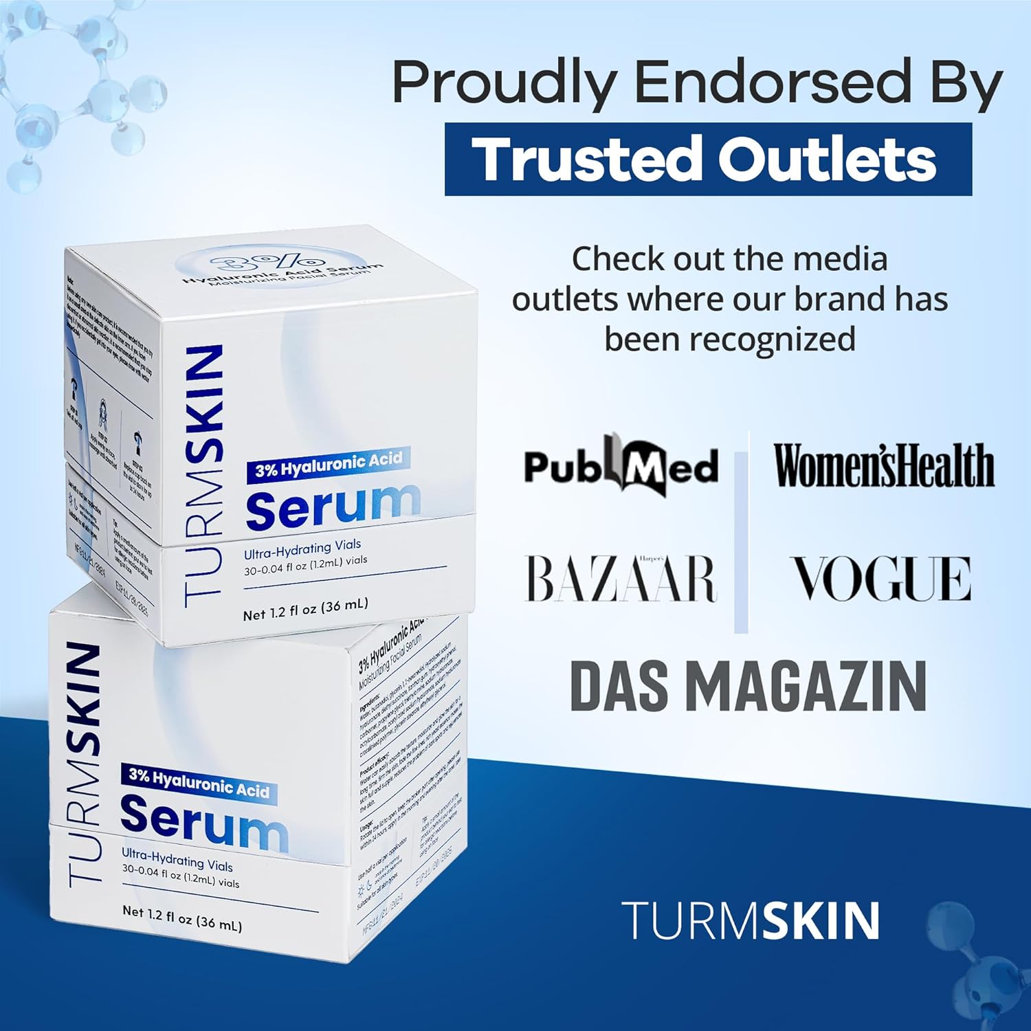 - REPAIR AND RENEW YOUR SKIN – Turm skin hyaluronic acid SERUM 3% Designed for topical skincare, this versatile hyaluronic acid serum helps restore skin volume, reduce wrinkles, promote smooth and firm skin. Penetrates your skin at varying depth to combat aging in the surface, middle, and deepest layers of your skin.