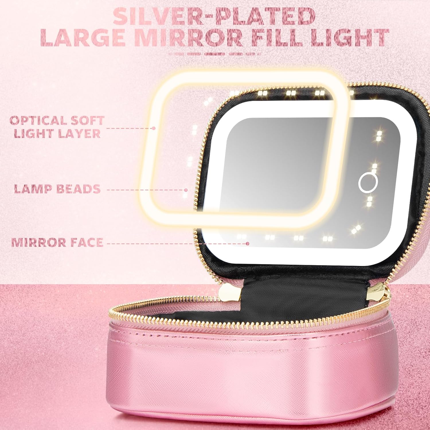Small Makeup Bag Travel Train Case with Mirror and Light Mini Travel Make up for Women Train Case Cosmetic Organizer 3 Adjustable Brightness Toiletry Bag Portable Artist Storage