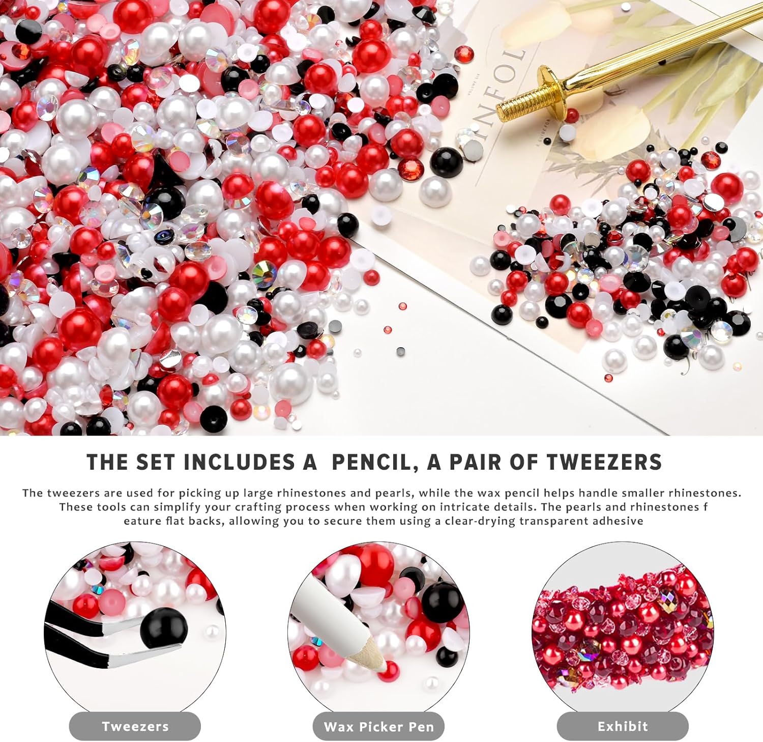 80g Mix Flatback Pearls and Rhinestones for Crafts Red Black and White Mixed Size 2mm-10mm Half Round Pearls Rhinestones for Nail Art Tumblers Shoes DIY Bedazzling with Tweezers Wax Pen