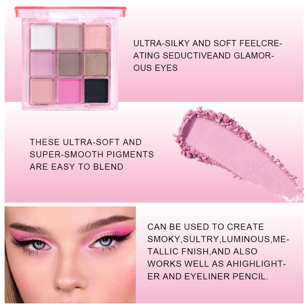- 1. 🎨 9 Stunning Eyeshadow Colors for Every Look Discover a versatile eyeshadow palette that includes White glitter, Nude matte, Pink glitter, Light purple matte, Brown matte, Gold glitter, Peach matte, Bright pink matte, and Black matte. These rich shades are perfect for creating everything from natural daytime eyeshadow to bold, glamorous looks.