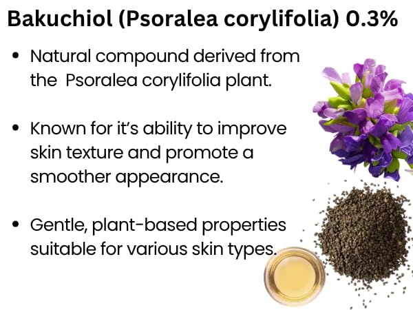 - [Bakuchiol] Bakuchiol is a plant-based natural anti-aging ingredient that is as powerful as Retinol, yet gentler on skin. Derived from the seeds of the Babchi plant, it is known to have potential to fight the appearance of fine lines and wrinkles and signs of aging. Bakuchiol does not irritate skin, making it more suitable for use on sensitive skin. Bakuchiol is integrated into both morning and evening anti-age skincare routines, paired with hydrating or plumping ingredients such as Hyaluronic Acid.
