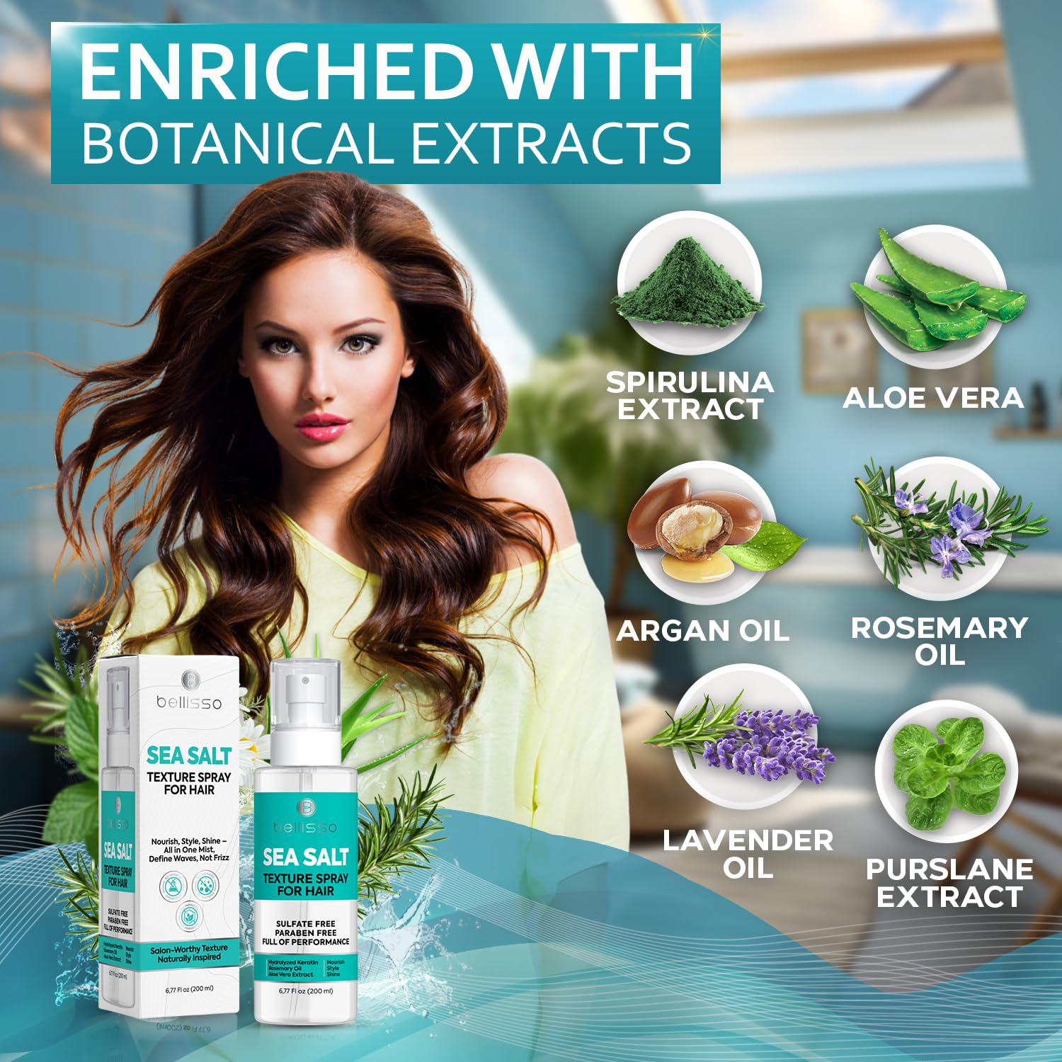 - NOURISHMENT ROOTED IN BOTANICALS: Bellisso’s salt water spray for hair is enriched with argan, castor, and rosemary oil to deliver deep hydration and a luminous, healthy shine. Experience a sea salt spray for hair women and men trust for smooth volume, soft texture, and refreshed movement. Finish your look with a sea salt texture spray for hair that leaves strands visibly nourished and never dry or brittle.