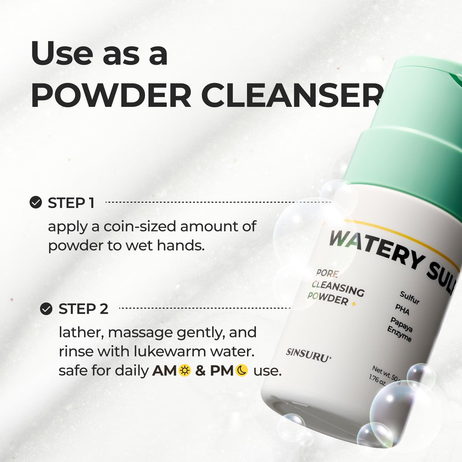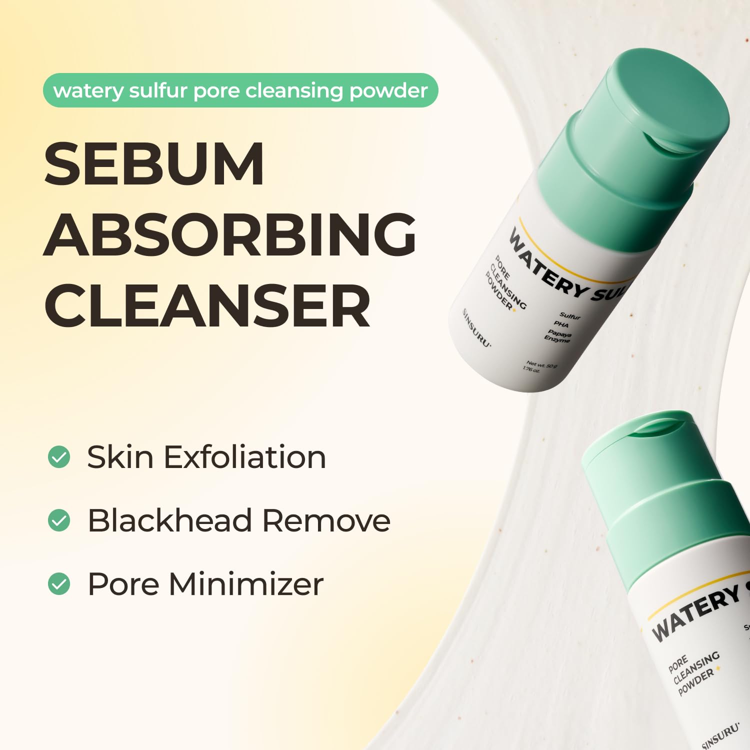 Watery Sulfur Pore Cleansing Powder, Korean Enzyme & Rice Powder & PHA Face Wash for Blackhead Removal, Sensitive and Acne-Prone Skin, Radiant Glow, Bumpy skin (1.76 oz / 50g)