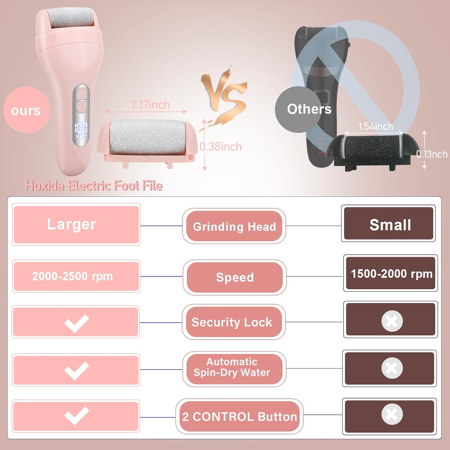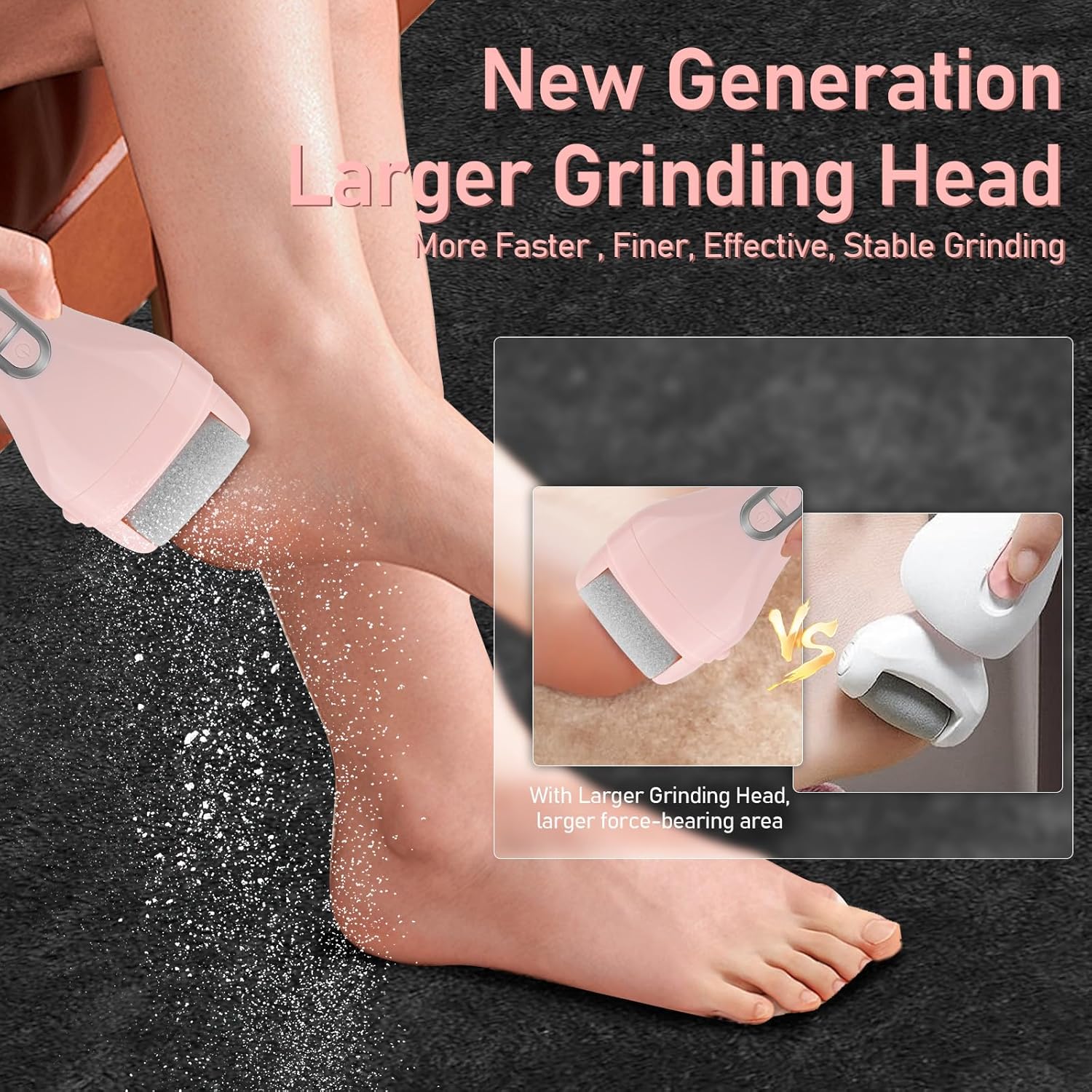- Pedicure kit with 3 Larger Grinding Head, 2 Speed, with LED lights - With more Bigger , more Larger Quartz Crystals Roller Heads, you could enjoy a more Faster,Finer, Effective, Stable Grinding callus remove foot care at home , 2 Speed (upgrade 2500RPM) Correspond to the roughness required to remove the calluses on the feet; with LED lights, automatically turn on while the foot grinder began working, help you see more clear and remove the deadskin around all angles .