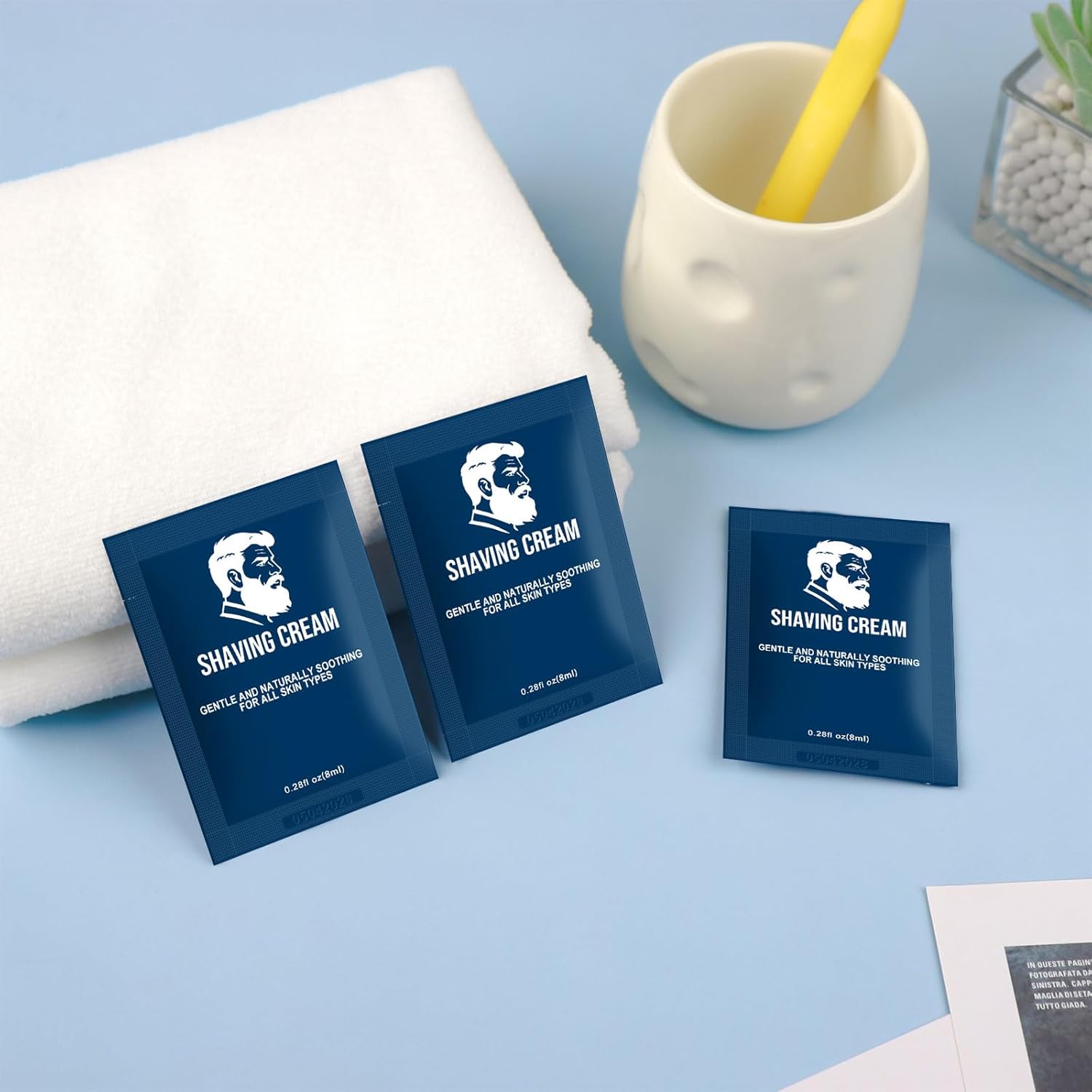 - 2.Travel Size Packets/ toiletries : 0.28fl oz of shaving cream bulk cheap, which meets airport regulations. It can be carried with you in your backpack or checked in luggage whether it's business trips, trips, or outdoor activities. No need to worry about liquid leakage or occupying too much space