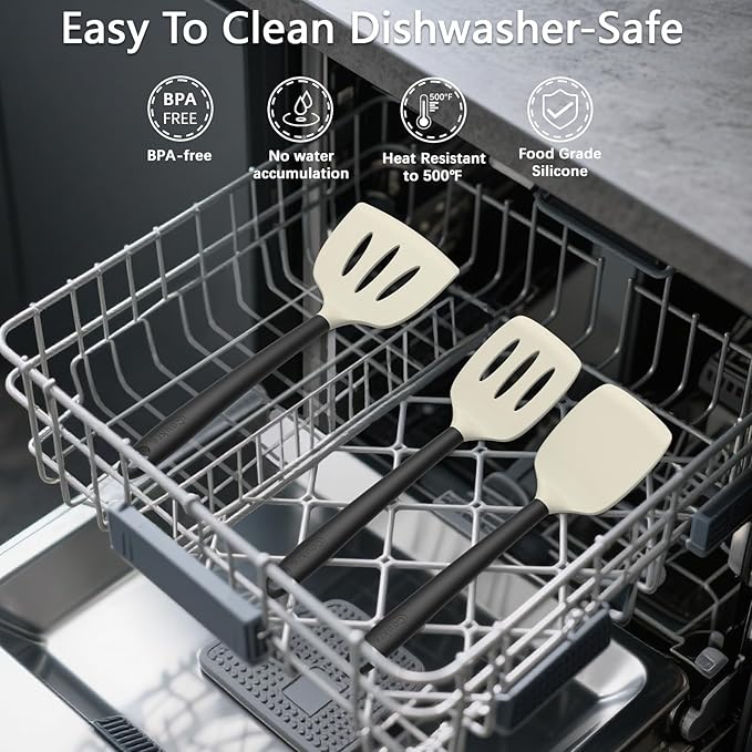 - [Easy to Clean & Dishwasher Safe]: The non-stick silicone surface makes cleanup a breeze, and all utensils are dishwasher-safe for added convenience. With top hanging holes and the included storage holder, organizing and storing your utensils is easier than ever