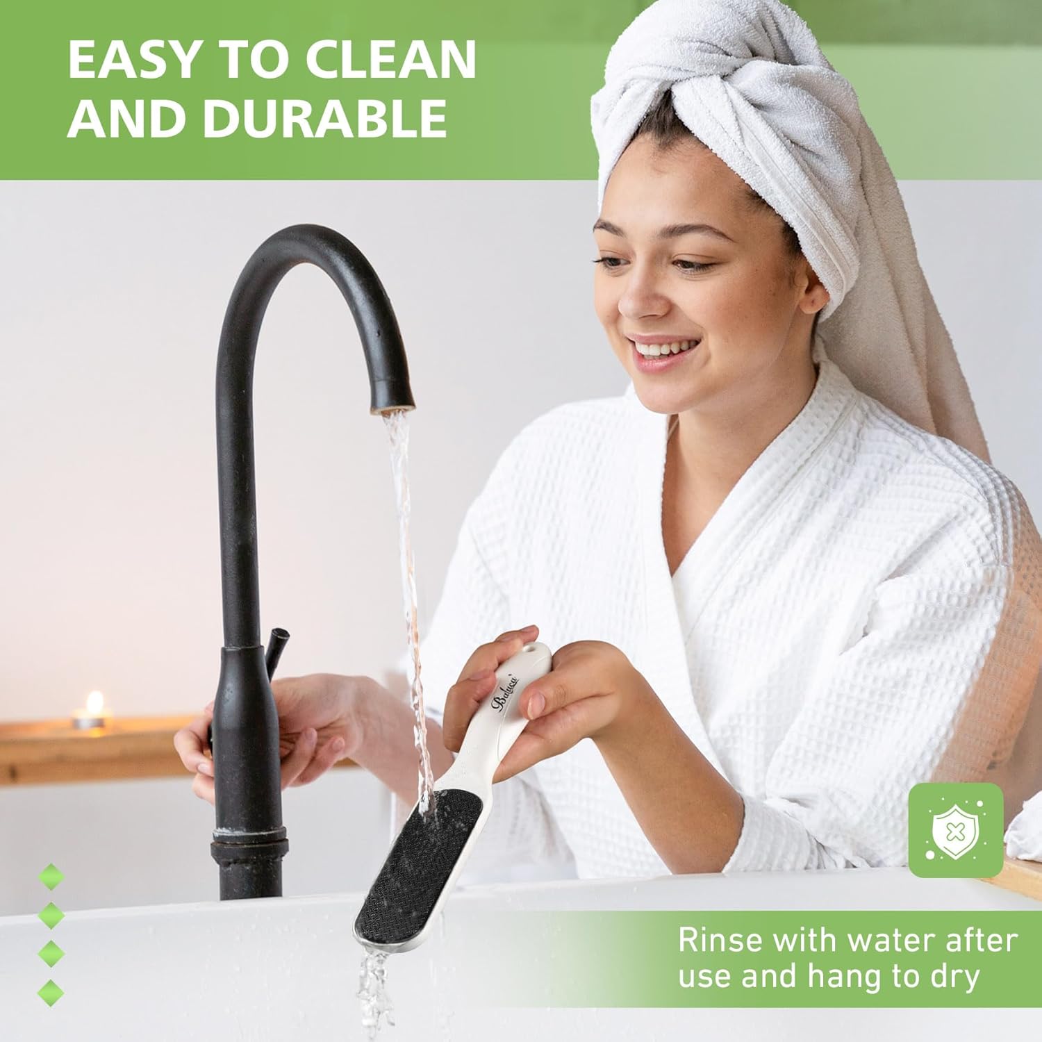 - Wet and Dry Use for Effortless Care : Use foot file in the shower on wet or dry feet to scrub and exfoliate dead skin revealing soft, silky smooth feet. Use this heel scraper for cracked heels in the shower or post-bath for enhanced effectiveness. A must have for your foot care routine.