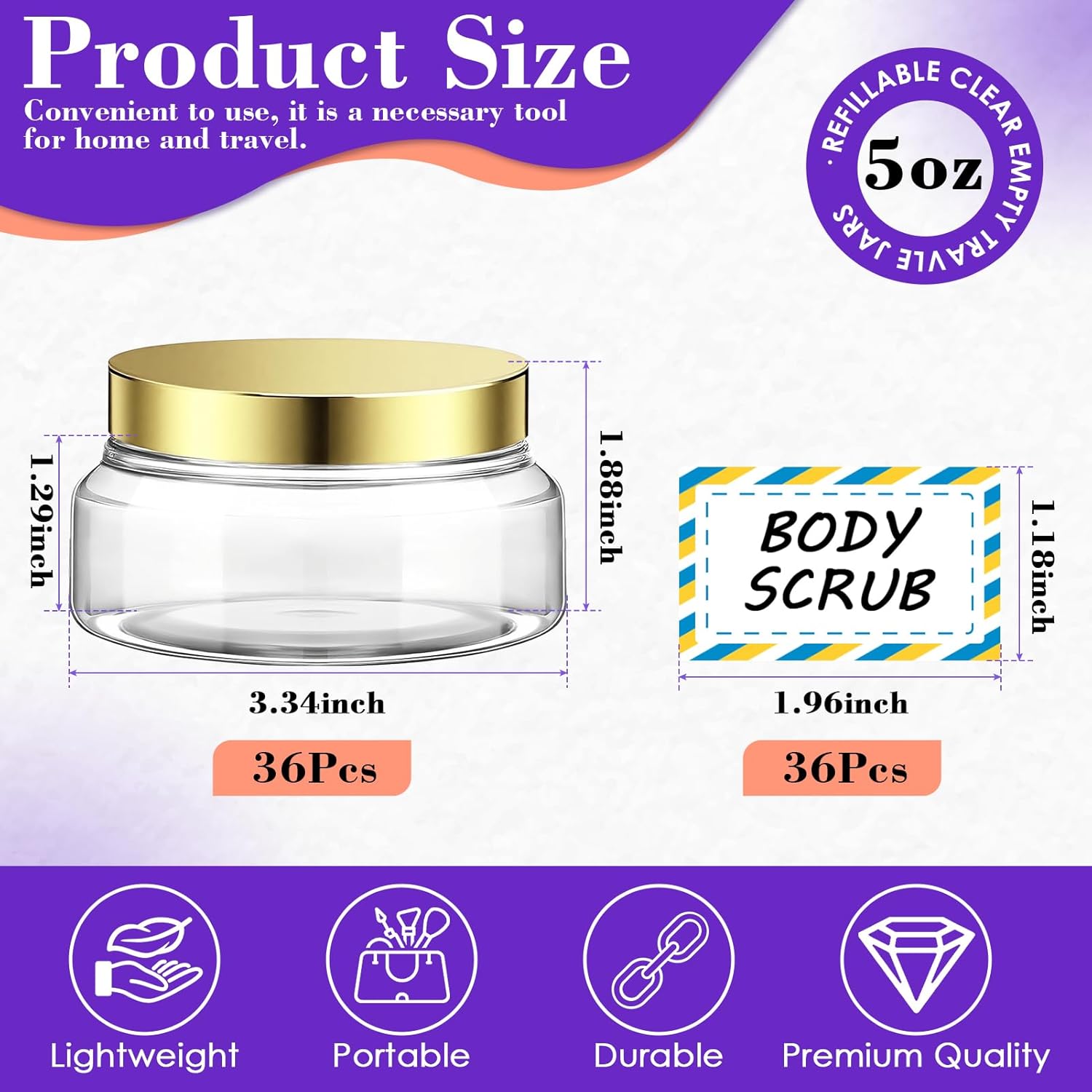 36 Pack 5 oz Plastic Cosmetic Containers With Lids Refillable Clear Empty Travle Jars Containers for Body Butter,Sugar Scrubs,Cream,Lotions,Candy, Waterproof Label&Spatulas - (Gold)