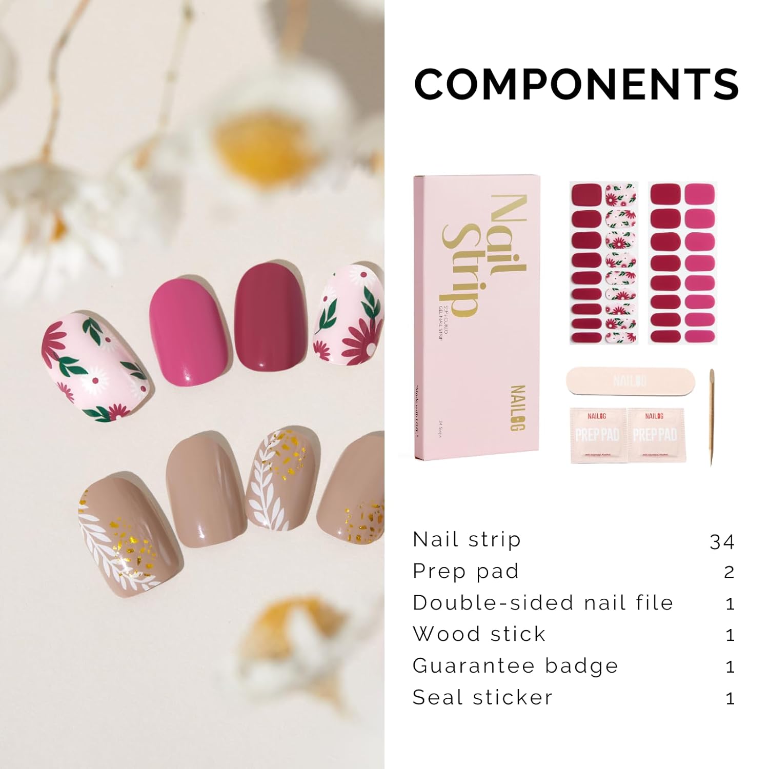Semi Cured Gel Nail Strips - NAILOG 34 Pcs Floral Nail Stickers Long Wraps with Glossy Gel Finishing for Autumn, in The Meadow