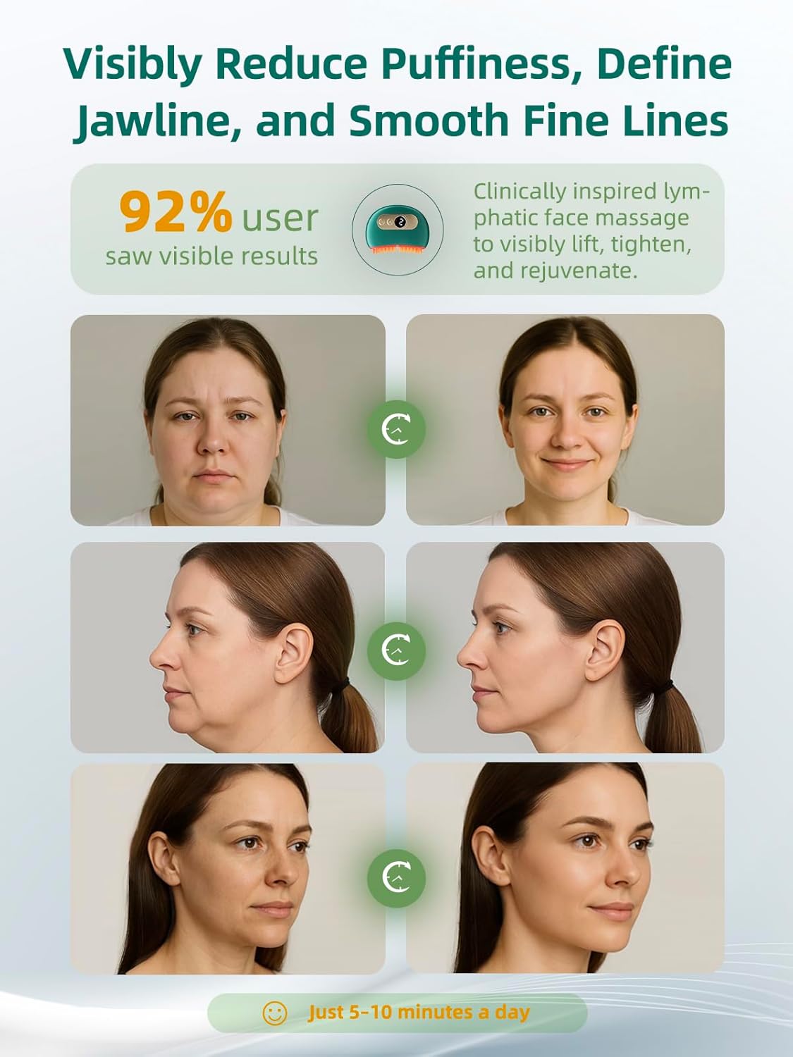 - 【 Sculpt & Define – Jawline + Double Chin Contouring 】 This face massager for lymphatic drainage lifts sagging skin and redefines your lower face. By targeting jaw tension and boost lymph flow, it visibly sharpens the V-line and reduces double chin appearance — giving you a naturally contoured, slimmer look without invasive tools.