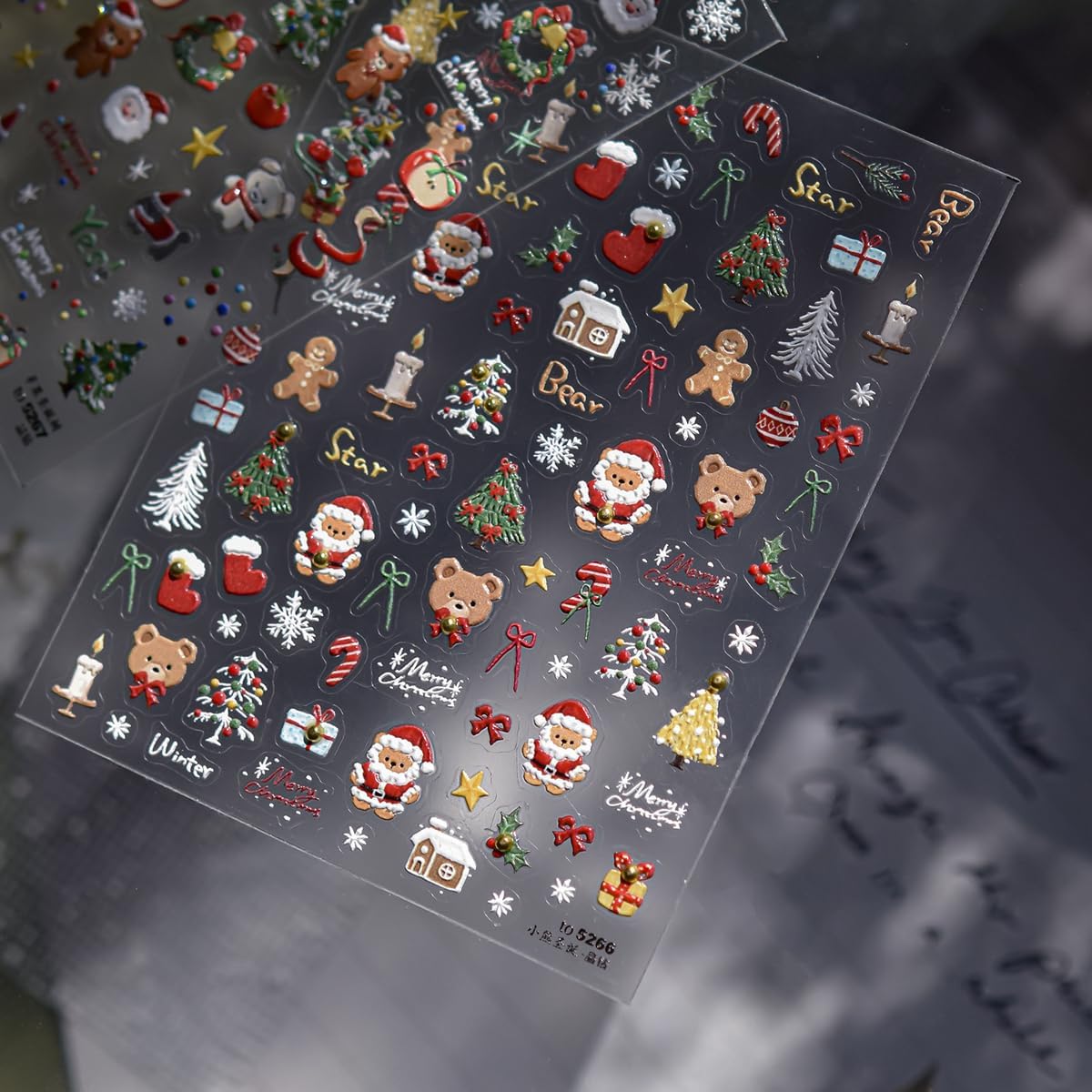 Christmas Nail Stickers Santa Claus Nail Stickers for Nails Art Bear Nail Art Decals with Xmas Tree Design 5D Self Adhesive Nails Charms Supply for Women Girls Manicure DIY Decoration Accessories
