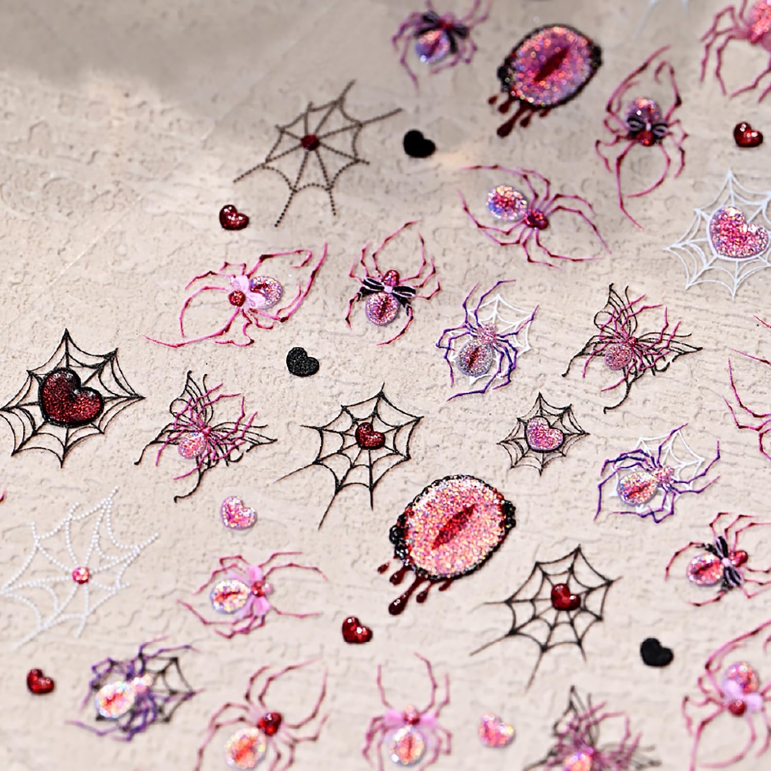 Halloween Nail Stickers 3D Self-Adhesive Goth Nail Art Stickers Pink Spider Web Spider Heart Glitter Design Halloween Acrylic Nail Art Decoration Cute Horror Nail Decals for Women Acrylic Nails DIY