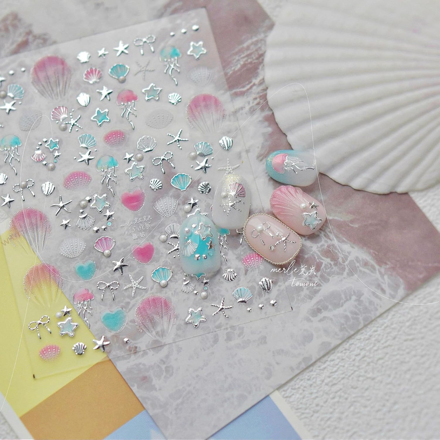 1 Sheets Summer Nail Stickers for Nails Art 5D Embossed Self-Adhesive Shell Starfish Nail Art Stickers Decals Silver Ocean Star Jellyfish Design Beach Nail Supplies for Women Manicure Accessories