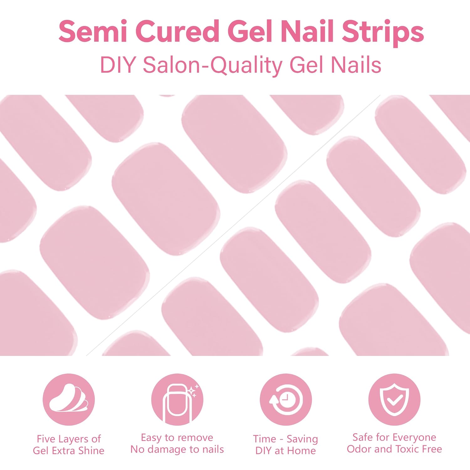 Semi Cured Gel Nail Strips-Multi-Size Semi Gel Press On Nails Stickers Sports & Shower Safe,Glossy Press Ons for Mom & Busy Lifestyle Works with Any UV/LED Lamps(Pink)