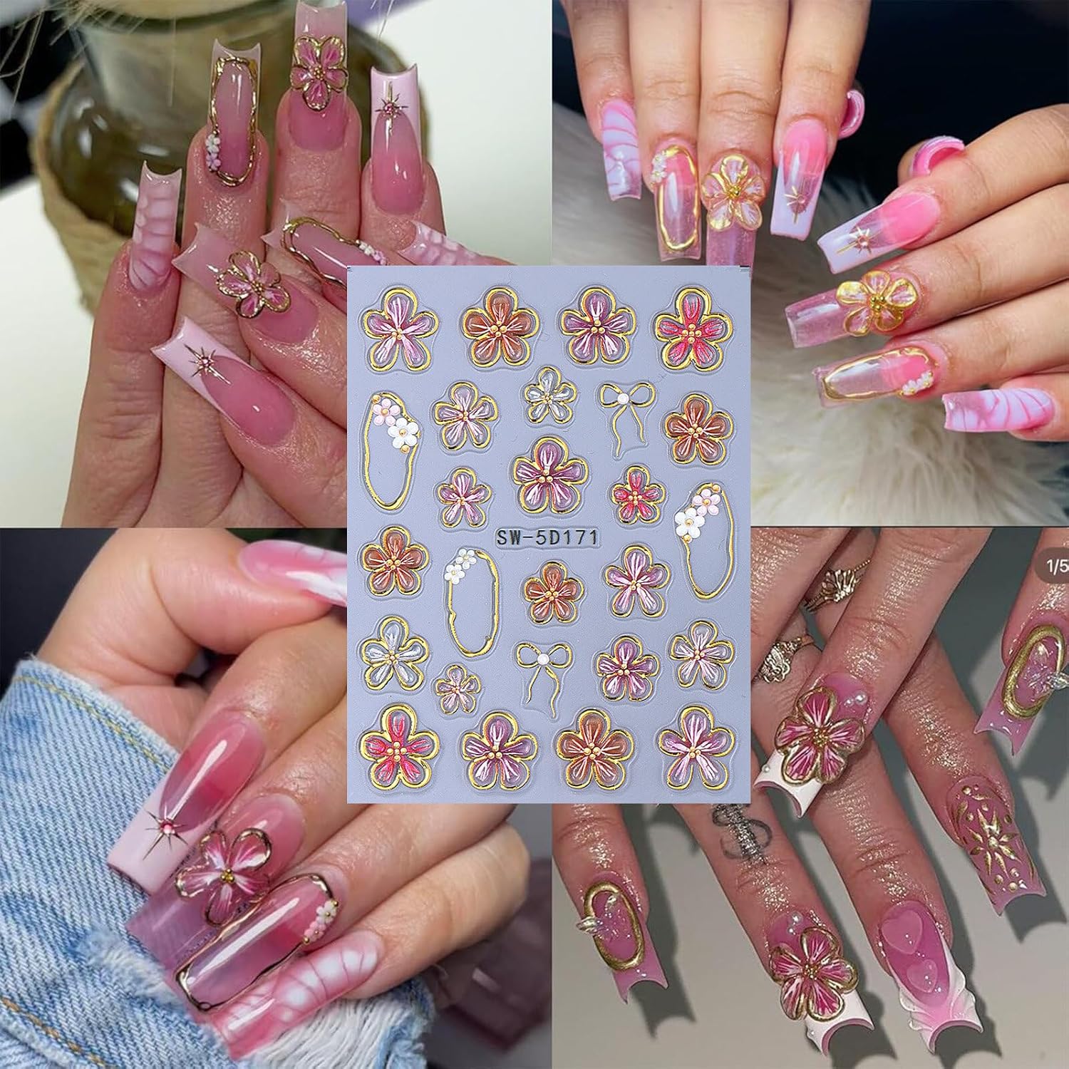 Flower Nail Stickers Decals 5D Embossed Flower Nail Decals Pink Five-Petaled Gold Floral Circle Spring Summer Nail Art Design Bow Tie Flowers Nail Adhesive Decals for DIY Nail Art Decorations 2Pcs