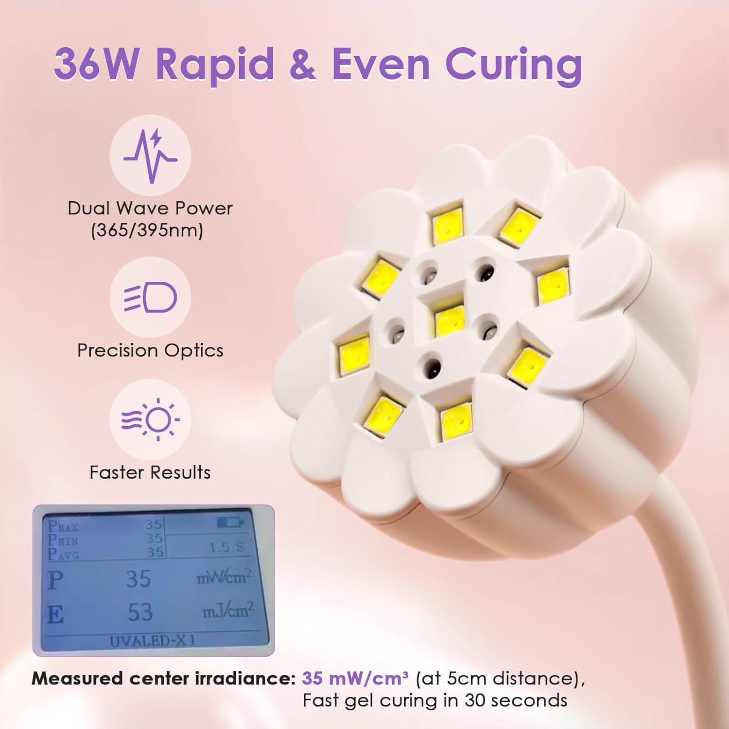 - 【Fast Drying Nail Lamp】 The nail lamp has 9 enhanced LED beads with wavelengths of 365nm + 395nm to provide a faster and better manicure experience, reduce glue shrinkage and wrinkling. The powerful 36W light source can quickly cure all types of nail gels perfectly.