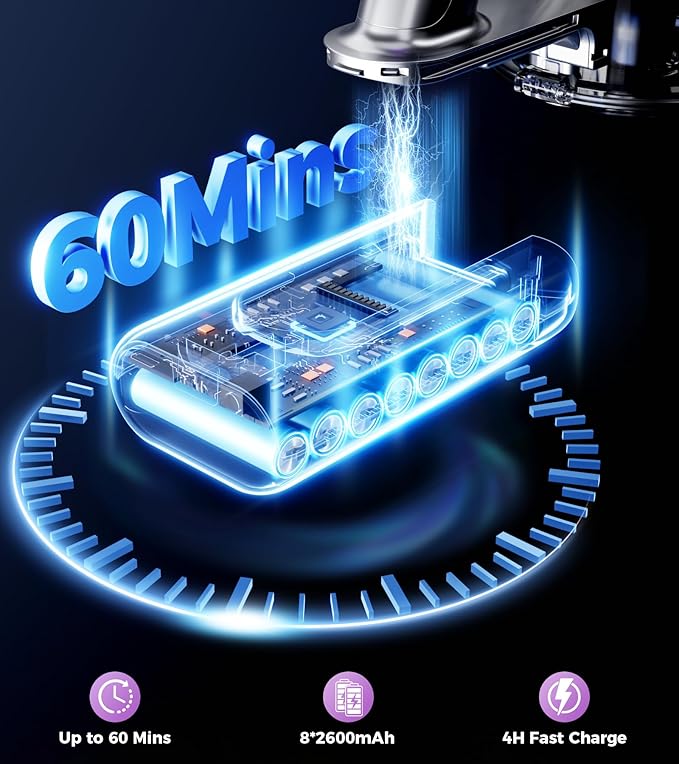 - ➤【Max 60-Mins Runtime】The stick vacuum built-in high-density 8*2600mAh battery pack, with intelligent power management system, The running time is up to 60 minutes, which can clean a 2,500 sqft house without interruption. Adopt BMS battery protection technology, support fast charging 4 hours full charge,The wall-mounted design combines storage and charging in one,Makes cleaning easier.
