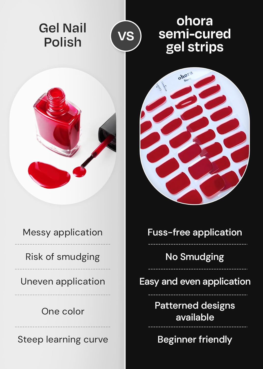 - Pro Tip for Beautiful Nails That Last 2 Weeks - After applying, cure the nail strips using ohora Gel Lamp for 2-3 times for best results and to minimize risk of chipping and pop offs.