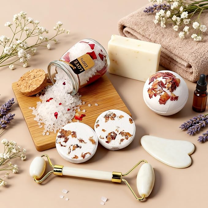 - UNWIND IN CALM AFTER A LONG DAY: After a busy day, she lights the lavender scented candle, pours warm drinks into the handcrafted coffee cup (stirring with its spoon) and reads the lavender greeting card, drops one of 2 eucalyptus shower steamer tablets for a spa shower; later, adds coconut bath bomb & sea salt with rose petals to a bath, lathers with cucumber-green tea soap, post-bath wraps in soft knitted blanket, massages hands with lavender hand cream, uses facial gua sha roller & board to ease tension, adorns space with lavender bouquet for a fully relaxing night.