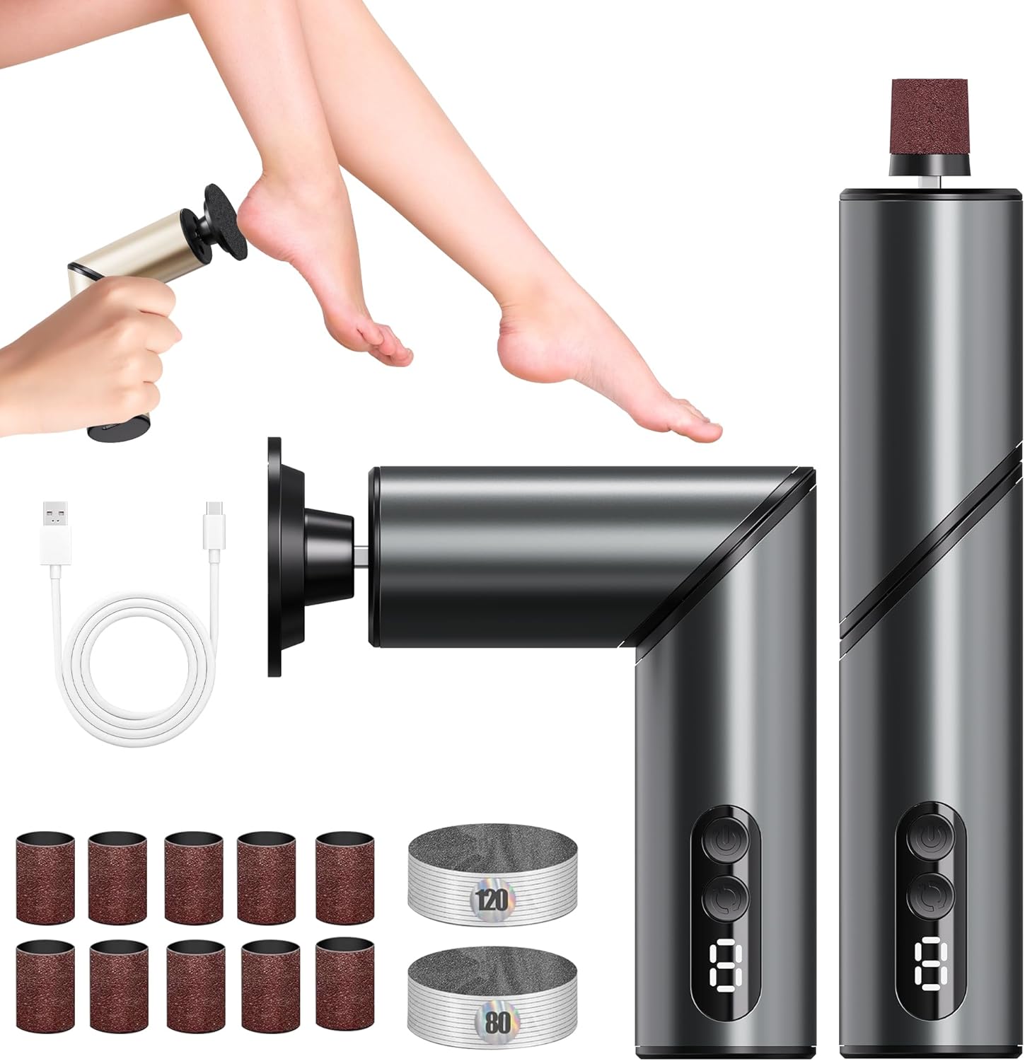 - [2-in-1 feet scrubber dead skin and nail grinder]:This calloused feet remover tool features an upgraded 2-in-1 design that can remove dead skin from the feet. It comes with 20 sanding discs (fine and rough) and 10 nail sanding rings, making it easy to use on high heels, toes, sides, and nails. At home, salon level hands and feet do not require additional tools. Sandpaper can be reused until it no longer has the ability to grind.