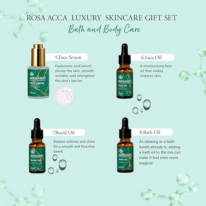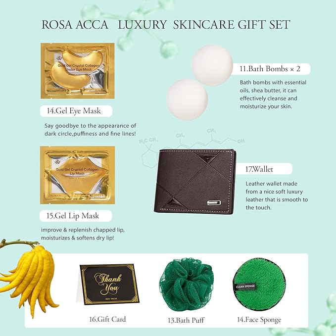 - Skin-Loving Ingredients: All Rosa Acca products are made from skin-loving ingredients you want. Rich in essential oils, ceramide, shea butter, argan oil, coconut oil and hyaluronic acid, it can effectively cleanse and moisturize your skin, Whether you have dry, oily or normal skin, our skincare & spa set is suitable for all skin types