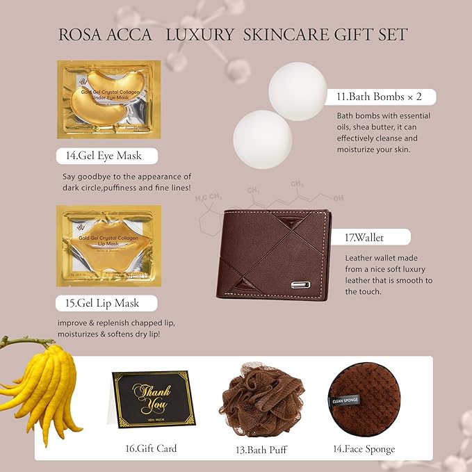 - Skin-Loving Ingredients: All Rosa Acca products are made from skin-loving ingredients you want. Rich in essential oils, ceramide, shea butter, argan oil, coconut oil and hyaluronic acid, it can effectively cleanse and moisturize your skin, Whether you have dry, oily or normal skin, our skincare & spa set is suitable for all skin types