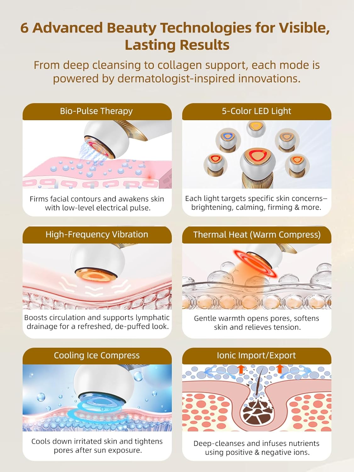- 6-in-1 Multifunctional Facial Device for Instant Lift & Long-Lasting Firmness: Achieve spa-quality results at home with this all-in-one device. It combines microcurrent, ion cleansing & infusion, vibration, heating, cooling, and 5-color LED light therapy to tighten skin, reduce wrinkles, deeply cleanse, enhance skincare absorption. Experience instant lifting & long-lasting firmness, revealing smoother, firmer, more youthful skin. Ideal for daily use to maintain a vibrant, youthful complexion.