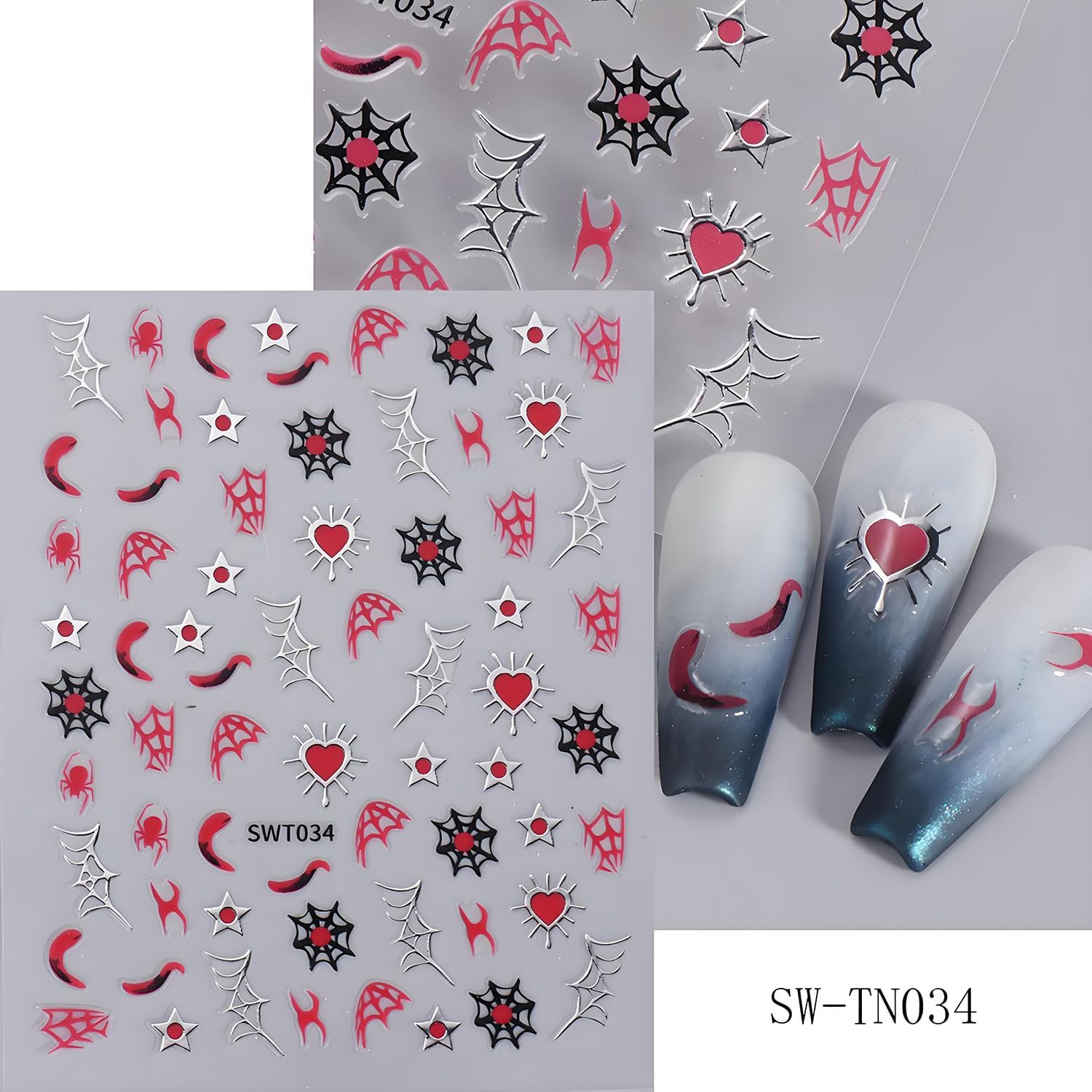 - ăHalloween Stickers SetăYou will get 5pcs Halloween nail decal, many Halloween elements patterns such as black, gold, sliver, heart, star, moon, spider, spider web and so on. So many choices that will meet your nail art decorations needs for Halloween party.