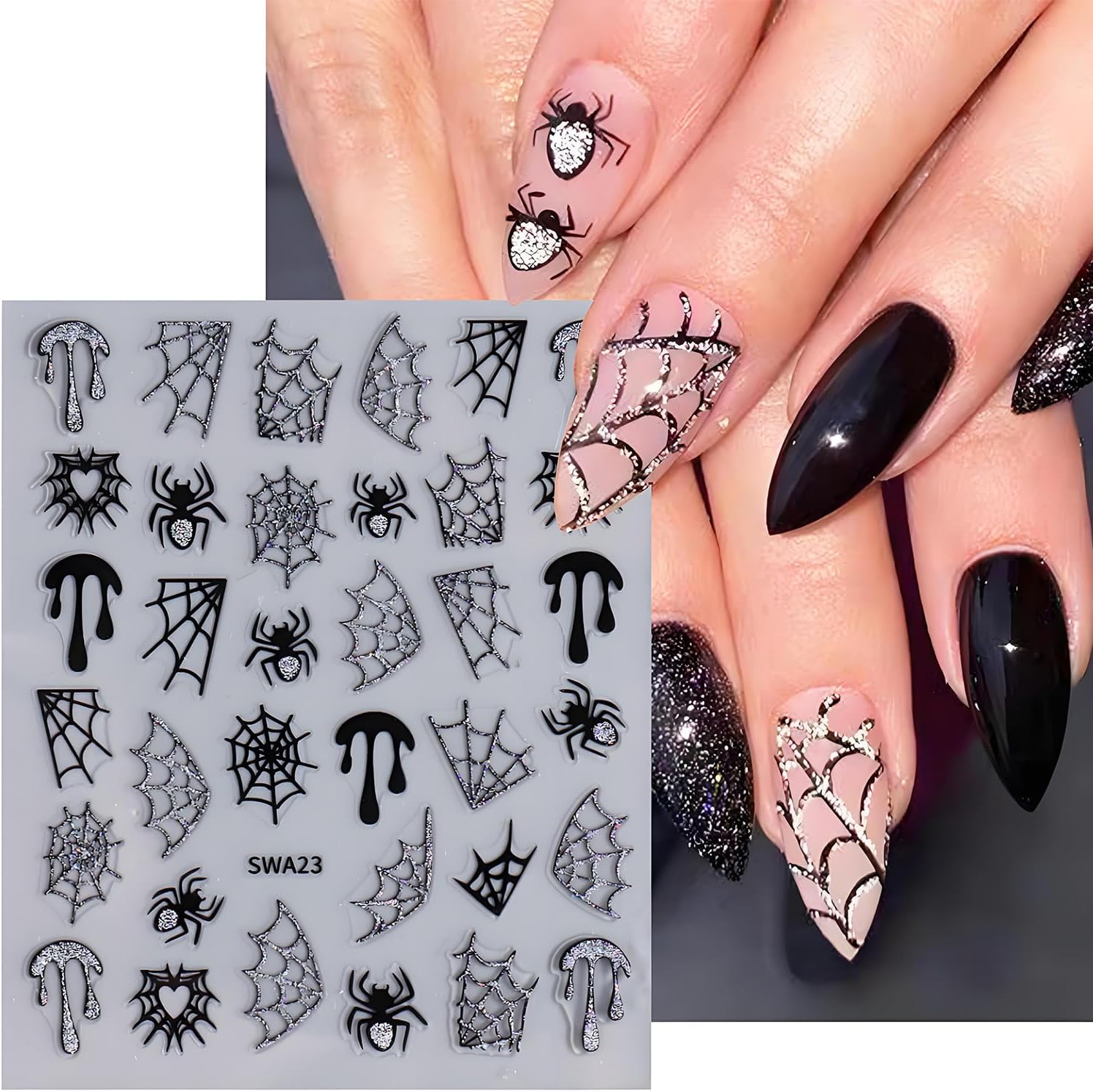 - ăHigh-Quality MaterialăOur glitter spider web Halloween nail art stickers made of high quality materials, not limited to any skin, and safe to use. Perfect for all nail types, these decals are a must-have for anyone seeking to create stunning nails.