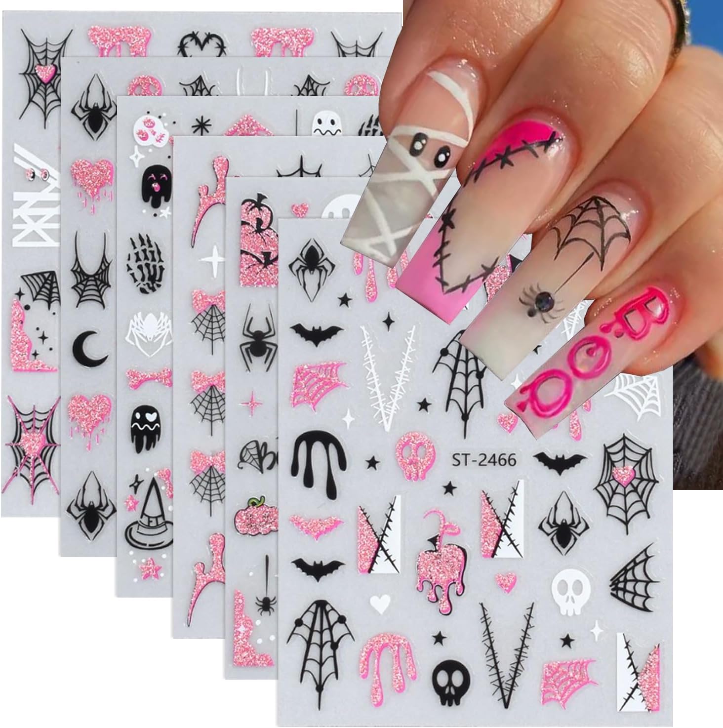 - Exquisite Design: Nail decals are designed with pink glitter , contains patterns mixed ghost ,spider, heart,can create nail art according to your hobby,let you get a different manicure and good mood