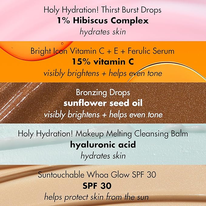 - WHAT’S INCLUDED: Makeup Melting Cleansing Balm, Bronzing Drops, Thirst Burst Drops, Vitamin C + E + Ferulic Acid Serum and Suntouchable Whoa Glow SPF 30 (all travel size).