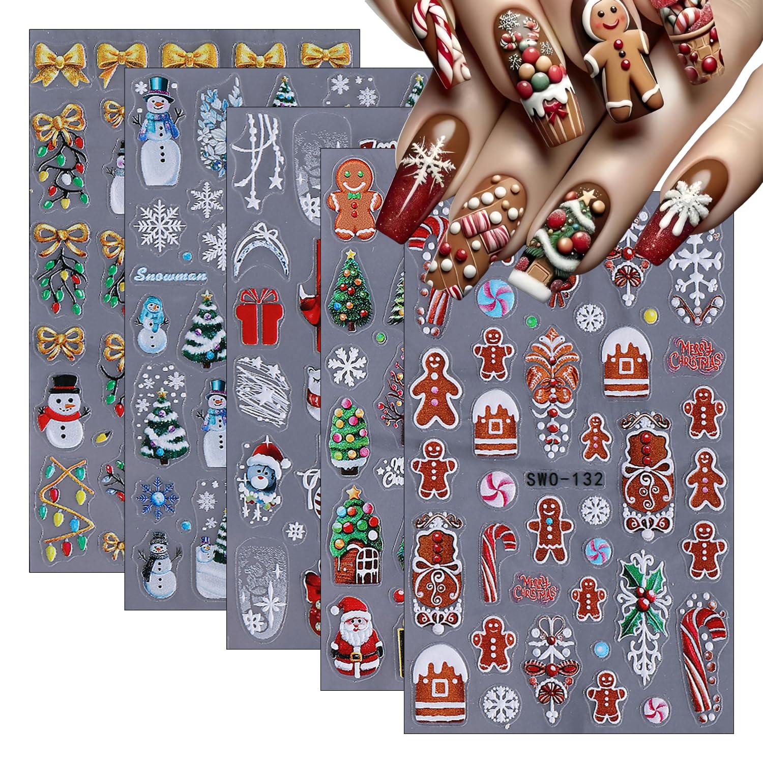 - Festive Designs: Includes 5 sheets of Christmas nail art stickers featuring adorable Santa Claus, reindeer, and gingerbread man designs for a fun holiday look