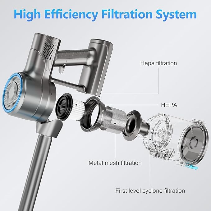 - đăEfficient filtration systemăCorded Vacuum cleaner features a fully sealed cyclone filtration system with a HEPA filter and stainless steel filter, capturing up to 89.99% of fine dust particles . It effectively prevents secondary pollution and ensures clean, fresh air
